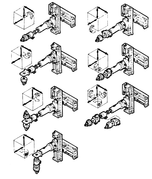 ´ëºÎºÐÀÇ »ê¾÷¿ë ·Îº¿µéÀº ±¸¸ÅÀÚÀÇ ¿ä±¸»çÇ׿¡ µû¶ó ÁÖ¹®Á¦À۵ȴÙ. ÀÌ¿¡ ´ëóÇÏ´Â ÇÑ °¡Áö ¹æ¹ýÀº ¸ðµâÈµÈ ¿ä¼Ò¸¦ »ç¿ëÇÏ¿© ÇÊ¿äÇÑ ÇüÅÂÀÇ ·Îº¿À¸·Î Á¶¸³ÇÏ´Â °ÍÀÌ´Ù. Mack Corporation »ç´Â 6 ÀÚÀ¯µµ Á÷±³ ·Îº¿À» ±¸¼ºÇÒ ¼ö ÀÖ´Â 9 °³ÀÇ ±âº»ÀûÀÎ ¿ä¼ÒµéÀ» °ø±ÞÇϰí ÀÖ´Ù. ÀÌ 9 °³ÀÇ ±âº»¿ä¼ÒµéÀº ±×¸² 14 ¿¡¼ º¸¿©ÁöµíÀÌ ±×¸®ÆÛ, ¾î´ðÅÍ (adapter) , x Ãà, y Ãà, z Ãà À̼ÛÀåÄ¡, ·Ñ (roll) , ÇÇÄ¡ (pitch) , ¿ä (yaw) ȸÀüÀåÄ¡, ±×¸®°í À§Ä¡ Áõ°¡ÀåÄ¡·Î ±¸¼ºµÈ´Ù.